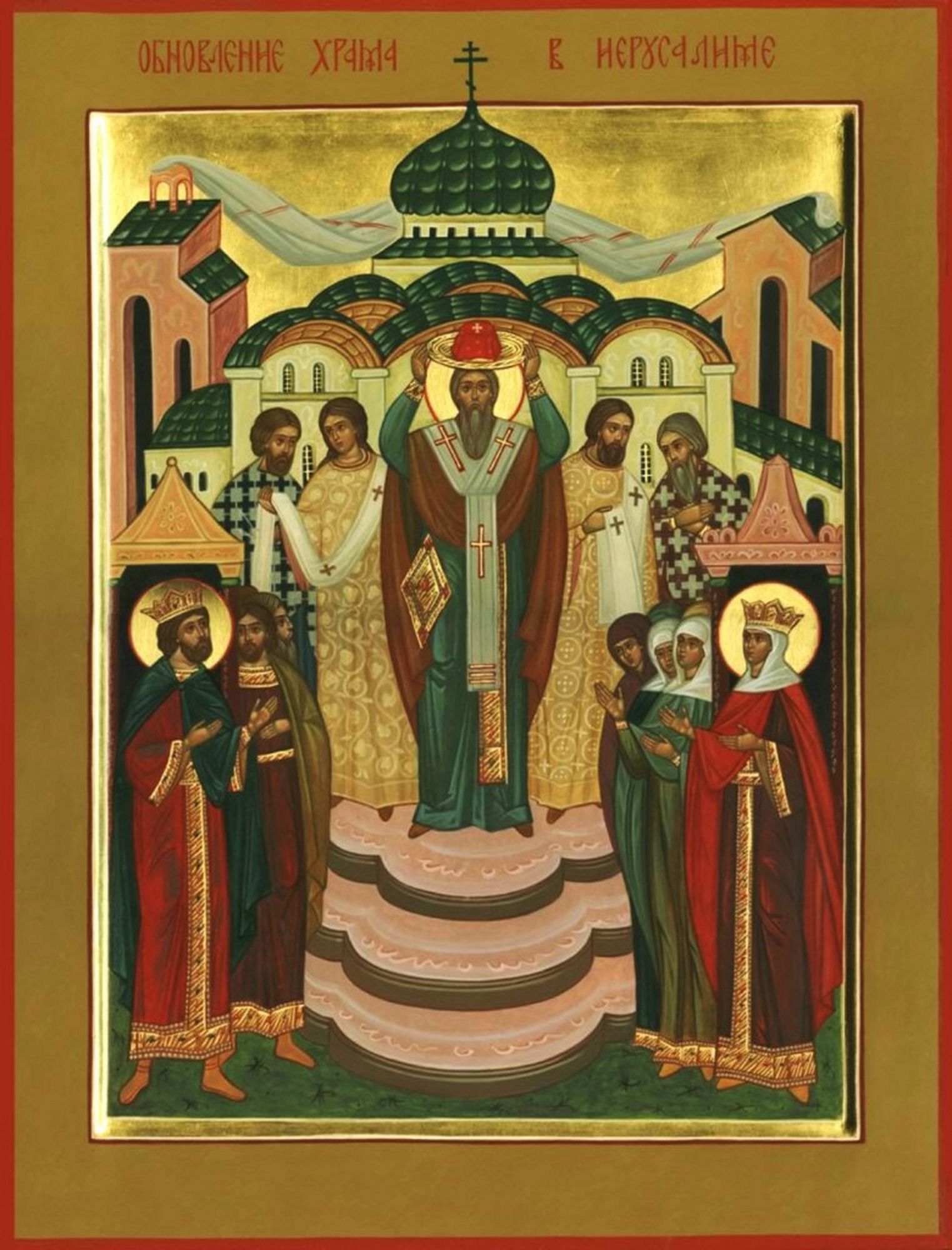 ”Pour rendre grâce à Dieu de l’heureuse conclusion du Concile de Nicée, Constantin le Grand voulut faire édifier une basilique sur le Golgotha, le lieu de la Rédemption du monde. L’évêque Macaire lui indiqua l’emplacement du tombeau, là où la tradition en conservait le souvenir; car l’endroit avait été couvert d’un remblai sous Hadrien (135), afin d’agrandir la ville. Après avoir creusé, on découvrit le saint Sépulcre ainsi que les instruments de la Passion, et on l’inclut dans un grandiose édifice recouvert d’une dôme: l’Anastasie, auquel fut adjoint une vaste basilique. La dédicace de l’église eut lieu le 13 septembre 335, pour remplacer la fête païenne de Jupiter Capitolin. Ce temple était si beau et ce lieu si vénérable, qu’il devint le symbole de la victoire du Christianisme et le modèle de toute église. Comme le terme grec pour désigner la consécration d’une église signifie littéralement «renouvellement» (enkainia), les saints Pères ont profité de cette célébration pour chanter en ce jour le renouvellement de toutes choses, la résurrection de la création sensible, accomplie par le Christ.